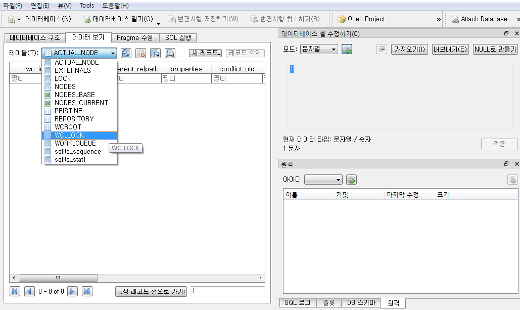 SQLite 실행 화면 3. SVN lock이 걸린 프로젝트의 [.svn]폴더에 들어가면 wc.db라는 파일이 있을 것이다.